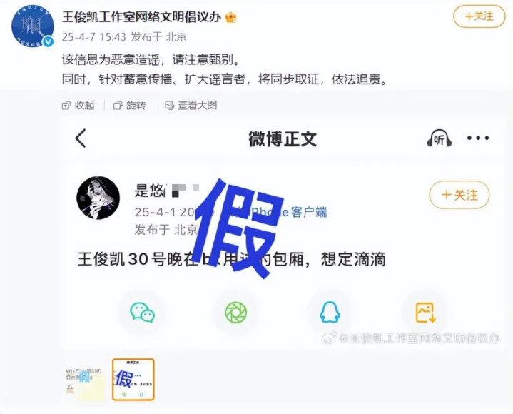 对此,7日下午,@王俊凯工作室网络文明倡议办发布声明:“该信息为恶意造谣,请注意甄别。同时,针对蓄意传播、扩大谣言者,将同步取证,依法追责。”
